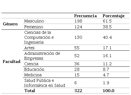 Un total de 322 estudiantes completaron el cuestionario, y sus respuestas fueron analizadas. La Tabla 1 presenta la distribución demográfica de los encuestados según género y facultad.