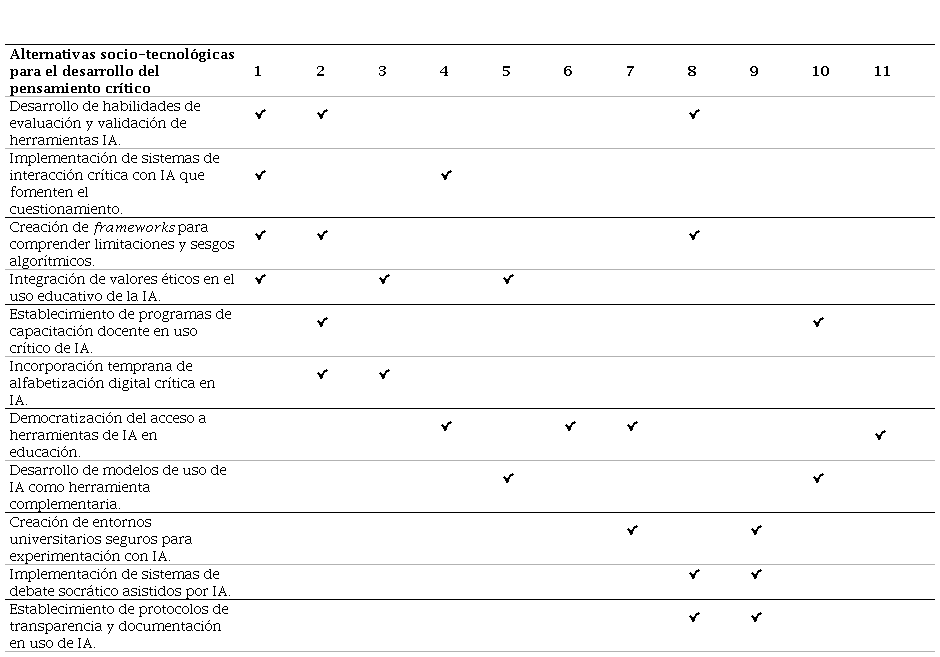 Entre las alternativas socio-tecnológicas disponibles (Apéndice; Tabla 8), los informantes destacan la necesidad de garantizar un acceso equitativo a las tecnologías de IAG. Advierten que, si no se gestionan adecuadamente, estas herramientas podrían ampliar la brecha digital y productiva entre quienes poseen habilidades para formular prompts efectivos y quienes carecen de ellas, subrayando el papel activo que la universidad debe asumir en la democratización de su acceso.