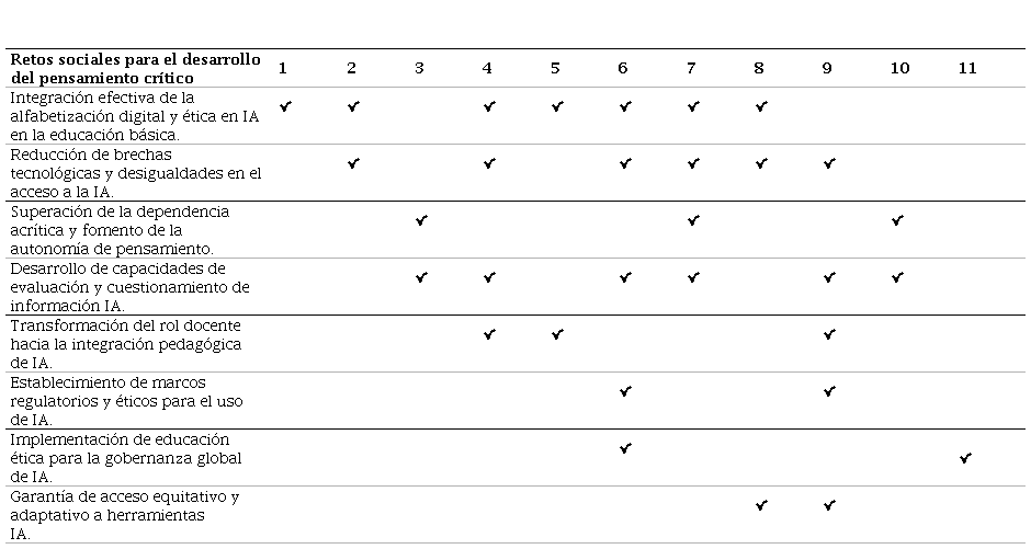 Los informantes destacaron los principales retos sociales que deben abordarse para fortalecer el pensamiento crítico en la educación universitaria a distancia en un contexto marcado por la generalización del uso de la IAG (Apéndice; Tabla 9). Existe un amplio consenso respecto a la necesidad de transformar los roles docentes actuales para mitigar la dependencia acrítica de la IAG y fomentar la autonomía de pensamiento.