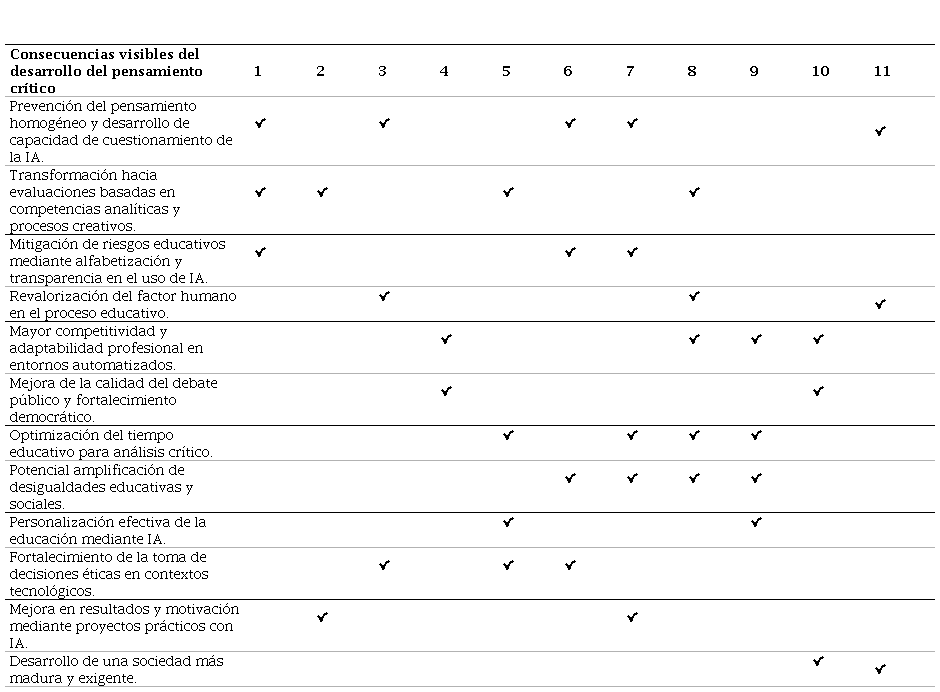 Según los consensos detectados, los informantes destacan que los riesgos asociados al uso de la IAG podrían mitigarse mediante la alfabetización digital y la transparencia algorítmica. Asimismo, señalan que una de las principales consecuencias del fortalecimiento del pensamiento crítico en el alumnado sería que, al estar apoyado por la IAG, mejoraría la velocidad del proceso de enseñanza-aprendizaje. Sin embargo, alertan que, dependiendo de cómo se implementen las políticas educativas, podrían surgir riesgos significativos de ampliación de las desigualdades sociales y educativas preexistentes. Por último, los entrevistados coinciden en que el desarrollo efectivo del pensamiento crítico fortalece las capacidades de liderazgo y resolución de problemas en los futuros egresados, favoreciendo perfiles más adaptables y reduciendo el riesgo de homogeneización del pensamiento.