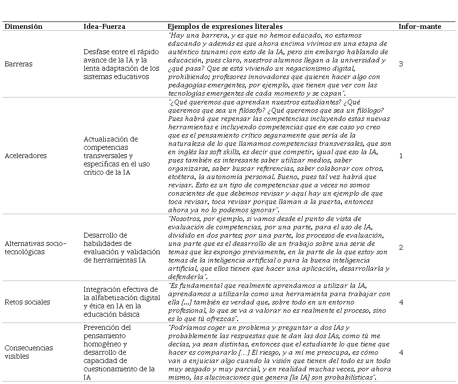 En la etapa siguiente, se empleó el modelo de lenguaje Claude 3.5 para apoyar la reformulación de la redacción de estas ideas-fuerza con el objeto de llevar a cabo una síntesis de los principales consensos identificados en la etapa anterior. Este proceso de búsqueda de consensos permitió condensar puntos de vista compartidos entre los informantes, articulando una sensibilidad común respecto a las cinco dimensiones analizadas: barreras, aceleradores, alternativas, retos sociales y consecuencias visibles. De este modo, se sintetizaron los resultados reflejando un espectro amplio de percepciones compartidas entre los participantes.