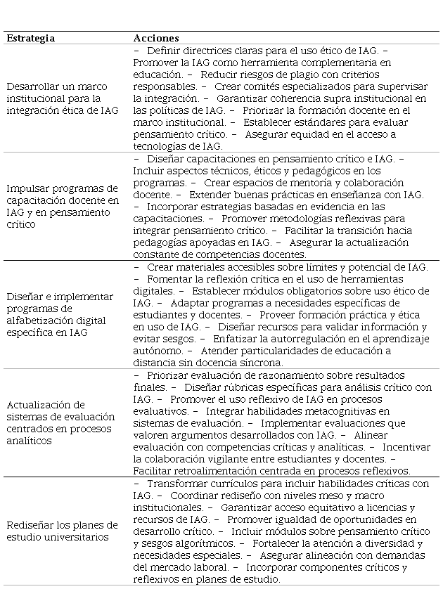 La insuficiente formación docente en pensamiento crítico y en el uso de IAG limita la capacidad de los educadores para diseñar estrategias pedagógicas que integren ambas dimensiones en el proceso de enseñanza-aprendizaje. En esta línea, diversos estudios destacan la importancia de fomentar el pensamiento crítico en los programas de formación inicial del profesorado (Lorencová et al., 2019; Mpofu y Maphalala, 2017; Ronderos et al., 2024) y de emplear estrategias metacognitivas que fortalezcan las competencias digitales en el aula (Pereles et al., 2024).