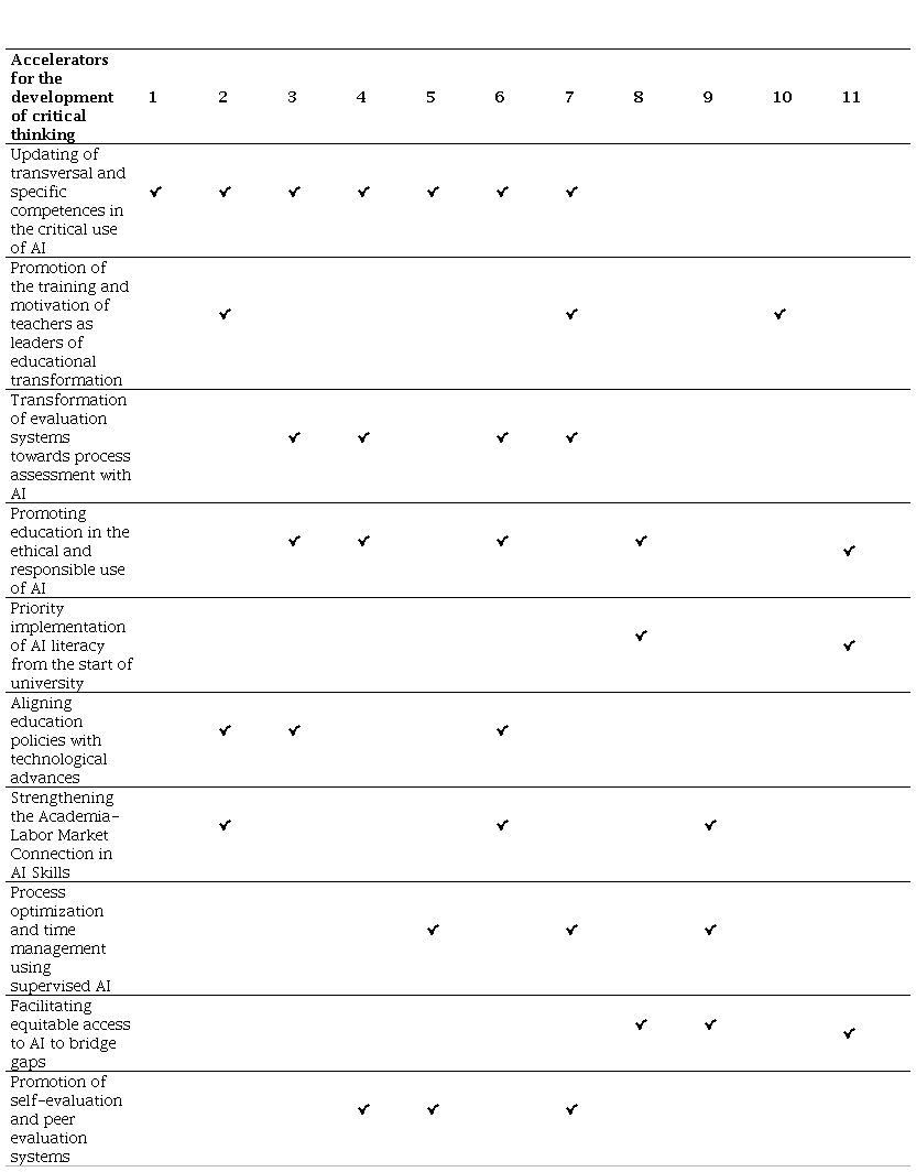The evidence found indicates the need to reform existing assessment systems, integrating GAI to optimise feedback and curricular adaptation. The alignment of educational policies with technological advances, from an ethical and responsible approach, could act as an accelerator to strengthen critical thinking. In this context, the experts consulted highlight teacher training and motivation (Ayanwale et al., 2022) and adequate coordination of public policies as key factors in overcoming the barriers identified.