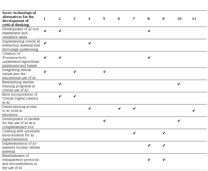 Among the socio-technological alternatives available (Appendix; Table 8), the informants highlight the need to ensure equitable access to GAI technologies. They warn that, if not properly managed, these tools could widen the digital and productive divide between those who have the skills to formulate effective prompts and those who do not, underlining the active role that the university must assume in the democratisation of their access.