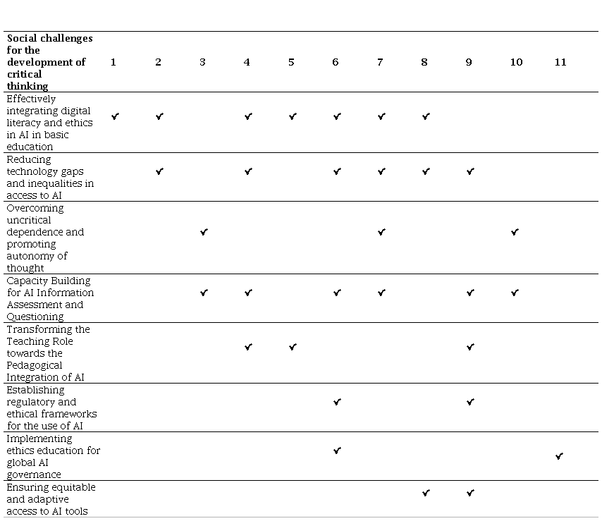 Informants highlighted the main societal challenges that need to be addressed to strengthen critical thinking in distance university education in a context marked by the widespread use of GAI (Appendix; Table 9). There is a broad consensus regarding the need to transform current teaching roles to mitigate the uncritical dependence on GAI and promote autonomy of thought.