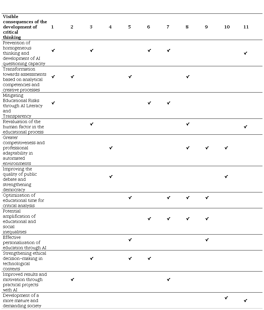 The data suggest that the interviewees have an impact on the understanding of critical thinking from an approach focused on transferable competencies, critical literacy and technological challenges. The integration of GAI and technology into educational environments emerges as a strategic axis; however, it requires methodological changes and solid training for students and teachers. In addition, the role of critical appraisal, debates and applied solutions reinforces the need to foster dynamic educational environments that prepare students to respond to the challenges of the digital society and the labour market.