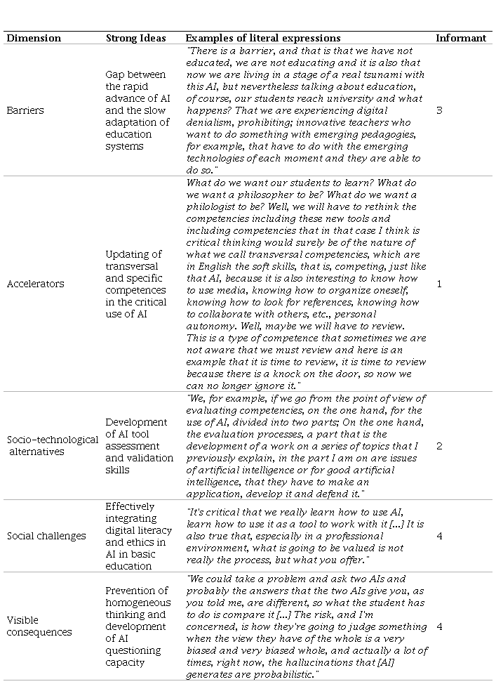 In the next stage, the Claude 3.5 language model was used to support the reformulation of the wording of these strong ideas to carry out a synthesis of the main consensuses identified in the previous stage. This process of seeking consensus made it possible to condense shared points of view among the informants, articulating a common sensitivity regarding the five dimensions analysed: barriers, accelerators, alternatives, social challenges and visible consequences. In this way, the results were synthesised, reflecting a wide spectrum of perceptions shared among the participants.