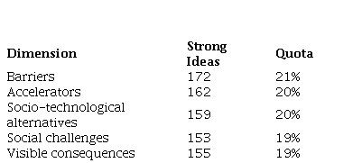 The transcription of the interviews allowed the extraction of 801 strong ideas, distributed according to the blocks presented in Table 5 (see Appendix). To ensure consistency and validity, the researchers coded these strong ideas individually by assigning them to the dimensions of the pentagonal model. The Fleiss Kappa index (κ = 0.82) confirms a high degree of agreement among coders, supporting the robustness of the analysis (Altman, 1990). Tables 6, 7, 8, 9 and 10 included in the Appendix report the details of consensus identified among the interviewed informants for each of the five dimensions3. The barriers, accelerators, socio-technological alternatives, social challenges and visible consequences included in these tables are presented synthetically, ensuring fidelity to the meaning expressed by the informants. Next, the ideas that have the greatest consensus4 in each dimension are discussed and connected to the previous academic debate.