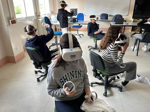 Fase 4. Aplicación del software educativo en RV. Cada centro contó con el equipamiento para la realización de las pruebas durante dos semanas (Figura 3). De forma previa a su utilización por parte del alumnado, los investigadores, con el apoyo de los docentes, explicaron las actividades a realizar en cada lección, así como el funcionamiento de los equipos con el fin de nivelar las posibles diferencias de experiencia previa en el uso de esta tecnología. El equipamiento utilizado consistió en las gafas Meta Quest 2, uno de los dispositivos de RV con mayor penetración en el mercado. La elección de este equipo se basó en su seguridad a la hora de ser utilizadas por adolescentes. El dispositivo es ajustable y no oprime la cara ni la cabeza. Es adaptable para las personas que utilizan gafas. No producen ningún daño a la vista, funcionan con batería recargable (como un smartphone) y no se utilizan conectadas a la corriente eléctrica, aspecto que facilitó su integración en el aula.