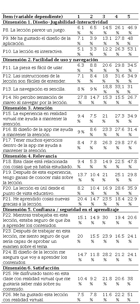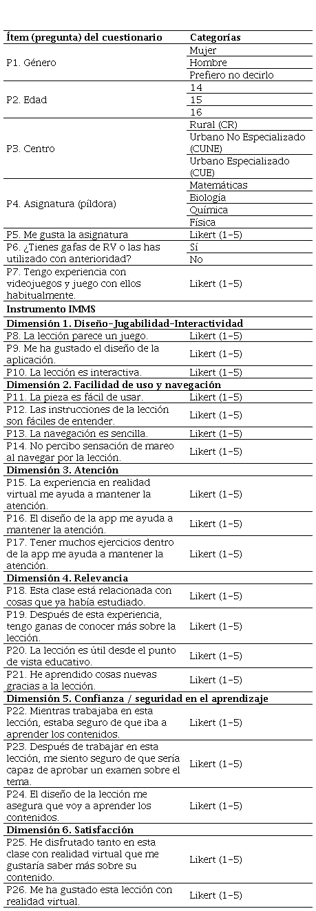 Como se indicó anteriormente, el instrumento utilizado fue un cuestionario basado en el test IMMS (Instructional Material Motivational Survey) propuesto por Keller (2010) y validado por Loorbach et al. (2015). En su versión original, el instrumento establece 12 ítems en escala de Likert con 7 opciones de respuesta. Para nuestro estudio, el instrumento sufrió las siguientes adaptaciones: (1) se incluyeron nuevos ítems para incluir las dimensiones de diseño / jugabilidad / interactividad y la facilidad de uso y navegación, (2) se simplificó la redacción de algunas cuestiones para hacerlas más comprensibles al nivel del alumnado y (3) se redujeron las opciones de respuesta a un total de 5 (1=Totalmente en desacuerdo; 5=Totalmente de acuerdo). Numerosos trabajos que han utilizado este mismo instrumento han realizado la misma adaptación de la escala a 5 puntos (Cardoso-Júnior y Delbone de Faria, 2021; Huang y Hew, 2016). Esta reducción de los tramos se justifica en que las escalas de 5 puntos son más fáciles de comprender y responder para los participantes, por lo que reduce la carga cognitiva durante su cumplimentación. El equipo investigador consideró este aspecto fundamental dado que los estudiantes debían responder el test justo después de haber probado el material en RV, con el consiguiente cansancio que esta actividad podría comportar en algunos estudiantes. La juventud del alumnado fue otro de los motivos para reducir el número de puntos, dado que con menos opciones los participantes podrían tener menos dudas sobre qué opciones elegir. En determinados contextos, como es el caso de audiencias poco familiarizadas con la realización de encuestas, una escala de 5 puntos puede resultar más adecuada.