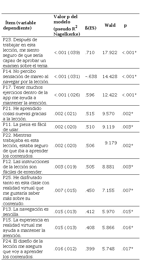 Estas desviaciones en la facilidad de uso percibida podrían estar afectadas por la existencia de diferencias de género significativas en la experiencia previa con tecnologías de RV (P6) y el hábito de jugar a videojuegos (P7). Para comprobar tales diferencias en la pregunta sobre la experiencia previa con tecnologías de RV («P6. ¿Tienes gafas de RV o las habías utilizado con anterioridad?»), se ejecutó un análisis por tablas bivariadas, que observó que los hombres tienen una experiencia previa con esta tecnología casi 8 puntos superior a la manifestada por las mujeres (50.3 % frente a 42.6 %). Por otro lado, a fin de observar las desviaciones de género en el hábito de jugar a videojuegos («P7. Tengo experiencia con videojuegos y juego con ellos habitualmente»), se llevó a cabo la prueba U de Mann-Whitney, cuyos resultados observan que los estudiantes varones tienen un hábito en el uso de videojuegos significativamente superior al reconocido por sus compañeras (U = 43985.50; p < .001). Estas desviaciones de género relativas al hábito y experiencia con tecnologías de RV y videojuegos podrían, en parte, explicar estas diferencias entre hombres y mujeres en cuanto a la percepción de facilidad de uso de la tecnología educativa en RV testada en nuestro trabajo.