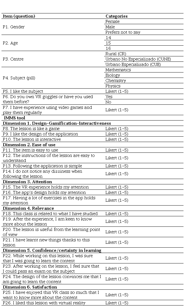 As mentioned above, the tool used was a questionnaire based on the IMMS (Instructional Material Motivational Survey) test, set out by Keller (2010) and confirmed by Loorbach et al. (2015). In its original version, the tool establishes 12 items on the Likert scale with 7 possible answers. For our study, the tool underwent the following adjustments: (1) new items were included to include the dimensions of design/gamification/interactiveness and ease of use, (2) the wording of some questions was simplified to make them more easily understood by pupils and (3) the number of possible answers was reduced to 5 (1=Totally disagree; 5=Totally agree). Numerous studies which used the same tool have also adapted the scale in the same way to 5 points (Cardoso-Júnior & Delbone de Faria, 2021; Huang & Hew, 2016). This reduction of the sections is justified by the fact that a scale of 5 points is easier to understand and answer for the participants, thus reducing the cognitive load for its completion. The research team considered this aspect fundamental, given that students had to answer the test just after they completed the experiment with the VR material, with the corresponding tiredness which the activity could cause in some students. The young age of pupils was another reason for reducing the number of points, given that with fewer options, participants could have fewer doubts as to which option they should choose. In certain contexts, as is the case of interviewees with little experience of responding to questionnaires, a scale of 5 points may be more appropriate.
