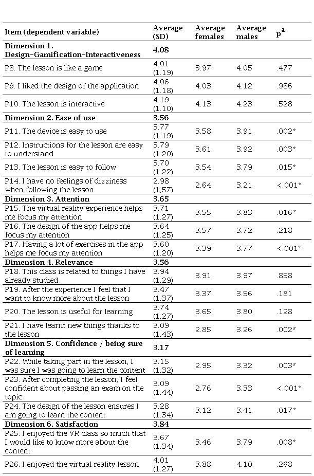 In addition to ease of use, notable discrepancies can be observed in all the questions from the same section referring to confidence in learning. Female pupils have a lower sense of confidence that they will learn from the VR lessons (U = 32245.00; p = .003) and, at the same time, are less confident of passing an exam after their activity in the lessons (U = 34061.00; p < .001). They also tend to perceive to a lesser extent that the design of the VR material ensures the learning of the contents (U = 31314.00; p = .017).