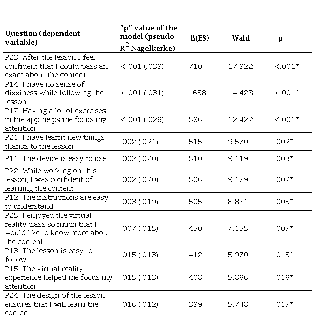 Once we had established which items registered statistically significant differences between the male and female participants of the study (in line with O2a), a study of predictive factors was performed - using ordinal logistic regression - to establish the causal relation between the 11 questions where such deviation exists (dependent variables) and the gender of the pupil (independent variable). To determine the appropriateness of the study, the parallel lines test was carried out, with a satisfactory result (p > .05 for all variables).