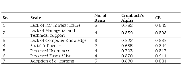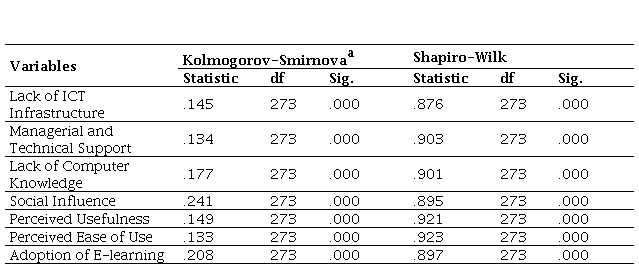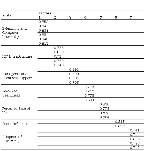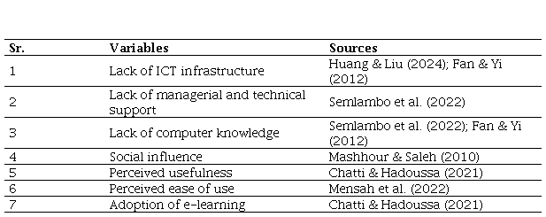 A questionnaire was used to collect data from the target sample. It was designed based on the factors identified in the literature review, including lack of ICT infrastructure, managerial and technical support, e-learning and computer knowledge among facilitators, social influence, perceived usefulness and ease of use (see Table 1). The questionnaires were distributed electronically through email and university portals. Participants were asked to respond to questions on their experiences with e-learning systems, their perceptions of the technology, and the challenges they face in adopting e-learning technology. The study variables are as follows: