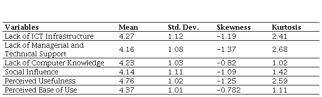Table 2 provides the descriptive statistics of the variables. The mean values for all variables exceed 4 on the scale, with perceived usefulness having the highest mean (4.76), suggesting that respondents view e-learning as highly useful. The standard deviations for all variables are relatively low, ranging from -3.0 to +3.0, indicating that responses are concentrated around the mean with limited variability (Sandler, 2021). Additionally, the negative skewness observed in all variables suggests that the distributions are left-skewed, meaning respondents tend to rate these aspects above average, reflecting favourable attitudes toward the factors examined. The kurtosis values, which range from 1.02 to 2.68, indicate that some variables exhibit a leptokurtic distribution, with more clustering around the mean and fewer extreme values, further reinforcing the consistency in responses.