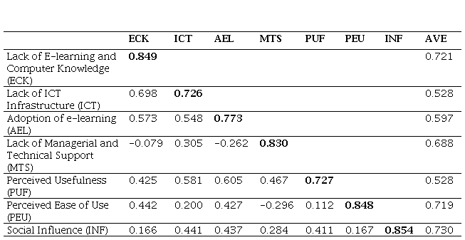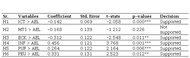 The study findings, as presented in Table 7 and shown in Figure 3, reveal that several factors significantly influence AEL, with social influence (INF), perceived usefulness (PUF), and perceived ease of use (PEU) demonstrating positive relationships, as indicated by coefficients of 0.456, 0.264, and 0.331, respectively. These findings suggest that INF, along with higher PUF and PEU, are critical determinants that facilitate the adoption of e-learning initiatives. Conversely, the analysis indicates that lack of ICT infrastructure (ICT), and lack of e-learning content knowledge (ECK) have negative impacts on AEL, with coefficients of -0.142 and -0.312, respectively. While ICT was found to significantly influence AEL (p < 0.01), the negative relationship suggests that reliance on ICT may inadvertently hinder adoption due to potential over-complexity or inadequate user support. Furthermore, lack of managerial and technical support (MTS) did not significantly affect AEL (p = 0.226), indicating a need for further exploration of how managerial training might be better aligned with e-learning strategies.