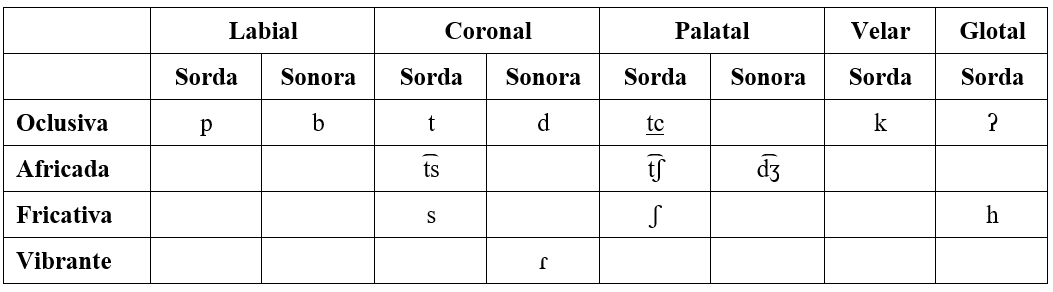 Cabe mencionar que aquí hemos realizado algunas modificaciones con respecto a la tabla presentada por Chevrier (2017, p. 60). En primer lugar, hemos excluido las aproximantes (representadas por Chevrier como /w/ y /j/) del conjunto de fonemas consonánticos, ya que la distribución de [w] y [j] indica con bastante claridad que son alófonos no silábicos de las vocales /u/ e /i/, respectivamente. En segundo lugar, hemos empleado el símbolo // en lugar de /