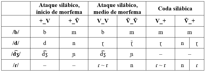 El fonema // sigue exactamente el mismo patrón, como se aprecia en los siguientes ejemplos; el 25 muestra la realización oral de la consonante final detrás de una vocal oral, mientras que el 26 ejemplifica la nasalización progresiva a partir de una vocal nasal en el mismo morfema.