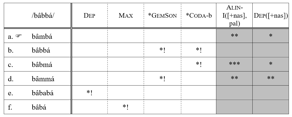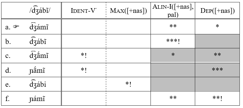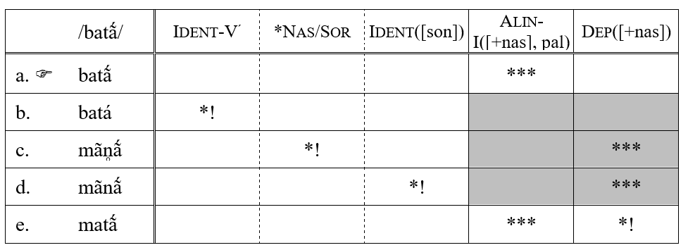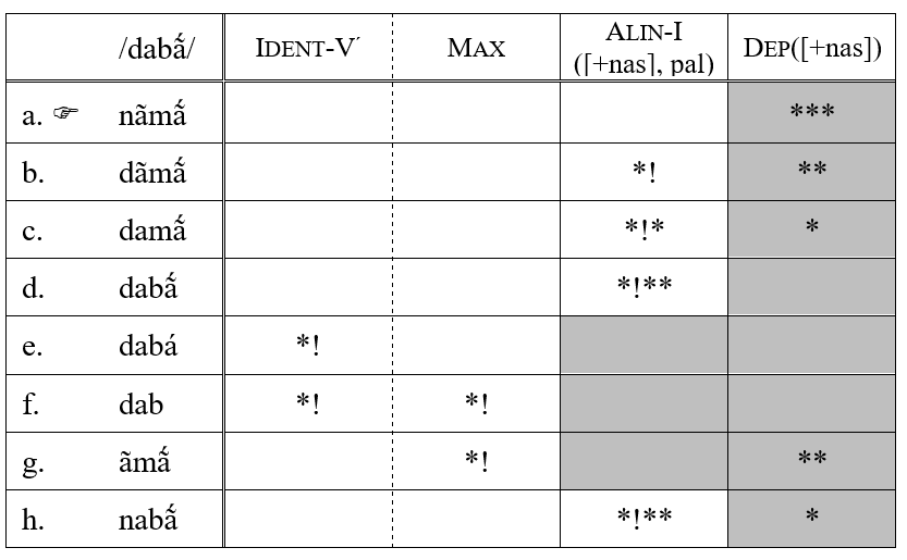 Se puede observar que las dos restricciones superiores en la jerarquía, IDENT- y MAX, previenen las alteraciones a la vocal acentuada y las elisiones en los candidatos e–g, los cuales, en caso contrario, le ganarían al candidato a. Asimismo, debido a que cada incumplimiento con ALIN-I([+nas], pal) provoca una marca de transgresión, sale ganando frente a los candidatos b–d, ya que todos los segmentos están asociados con el mismo autosegmento [+nasal]. El candidato h está incluido en la tabla para ilustrar que la nasalización espontánea, en este caso de /d/, no reduce la cantidad de violaciones a ALIN-I([+nas], pal).