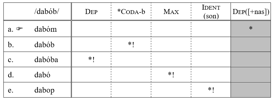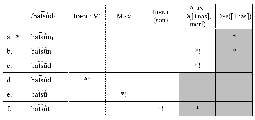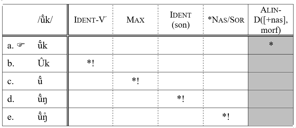 Gracias a la restricción de alineamiento hacia la derecha, el candidato más fiel al aducto es eliminado antes que el ganador, que presenta una nasalización de la consonante final. Las demás restricciones incluidas en la tabla se encargan de conservar la nasalidad de la vocal tónica y prevenir la elisión y la desonorización de la última consonante. En cuanto a los candidatos a y b, el segundo comete una transgresión a ALIN-D([+nas], morf) debido a sus dos autosegmentos [+nasal], de los que uno no llega hasta el límite derecho de la palabra.