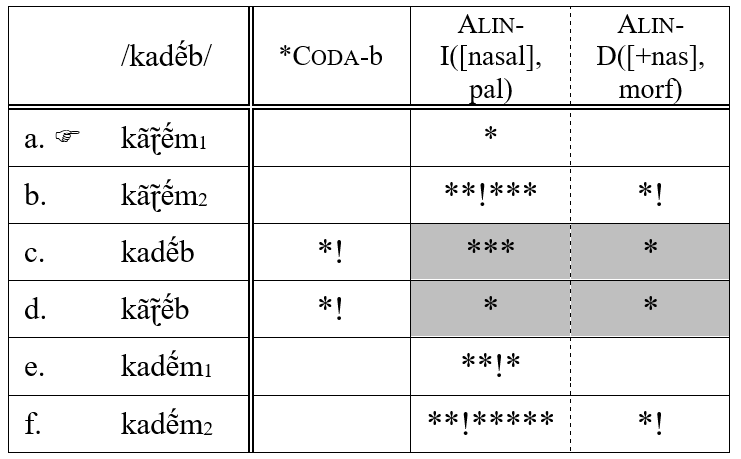 La alta posición de *CODA-b en la jerarquía asegura que se eliminen los candidatos con [b] final, y ALIN-I([nasal], pal) favorece a los candidatos con armonía nasal que llega hasta la consonante bloqueadora /k/. El hecho de que el candidato a, en el que [ẽ] y [m] comparten un mismo autosegmento nasal, le gane al candidato b significa que la nasalización de /b/ en coda silábica tiene que clasificarse como un resultado de propagación nasal hacia la derecha, y no como hipersonorización, cuando la vocal precedente es nasal.