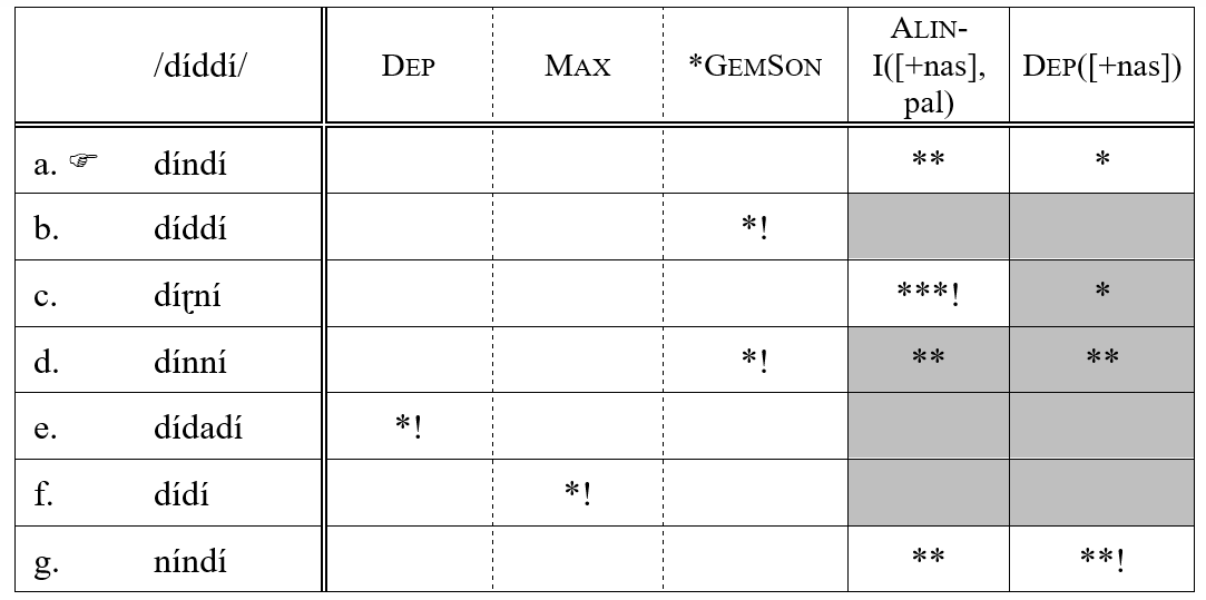 Aquí se aprecia, en primer lugar, que DEP y MAX previenen la elisión de una de las dos consonantes y la inserción de una vocal entre ambos, como ocurre en los candidatos e y f, respectivamente. En segundo lugar, la nasalización de ambas, como en d13, tampoco funciona, ya que sigue habiendo una consonante sonora geminada. Por lo tanto, los tres candidatos restantes son a, c y g. En a y g, la primera consonante se nasaliza, y en c, la segunda se nasaliza (y la primera /d/ se pronuncia [], debido a una restricción relativa a la coda silábica que no es tratada en este artículo). La nasalización de una consonante genera un autosegmento [+nasal], por lo que entra en juego ALIN-I([+nas], pal), cuya definición no implica que el segmento desencadenador tenga que ser una vocal. Debido a que esta restricción incita una propagación hacia la izquierda, los candidatos que nasalizan a la primera de las dos consonantes cometen una transgresión menos que el otro. Al final, el candidato g es eliminado como resultado de las dos nasalizaciones de fonemas orales.