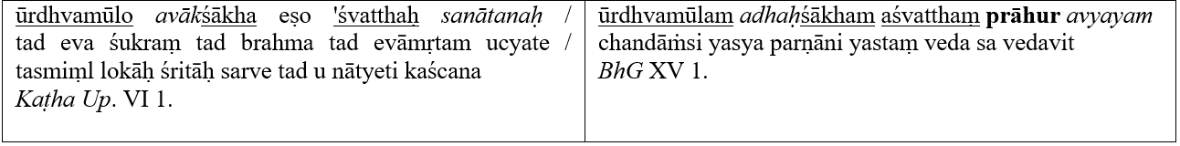 Reparemos, por último, en el carácter intertextual de este pasaje. La estrofa uno incluye un “dicen” (prāhur) y posiblemente haga referencia a la Ka ha Upani ad, donde no solo encontramos la misma imagen del árbol invertido, sino que incluso utiliza las mismas expresiones. En ambos casos, se trata del mismo árbol, el a vattha, y se afirma que las raíces están arriba (ūrdhvamūla) mediante una expresión idéntica. También en ambos pasajes las ramas ( ākha) están abajo, aunque en la Ka ha se utiliza el adverbio avāk mientras que la Gītā usa adhas para indicar la dirección. En los dos pasajes, se alude a la eternidad del a vattha mediante los términos sanātana (Ka ha) y avyaya (Gītā)88. Parecería, pues, que se trata de una cita textual y explícita. Llama la atención, asimismo, que en la Gītā se afirma que quien conoce esto es un conocedor del Veda, y, haciendo a un lado el carácter simbólico del conocimiento aludido en esta imagen, también debemos tener en cuenta que al tratarse de una cita de la Ka ha Upani ad, Ka está afirmando, en un sentido más literal, que quien entiende de qué está hablando es porque conoce la Upaniad. En un sentido más profundo, se podría entender que Ka está otorgándole a ese pasaje de la Ka ha que él cita un carácter paradigmático del conocimiento transmitido por el Veda, como si la imagen del árbol de la Upaniad poseyera una clave hermenéutica para comprender el sentido subyacente del Veda.