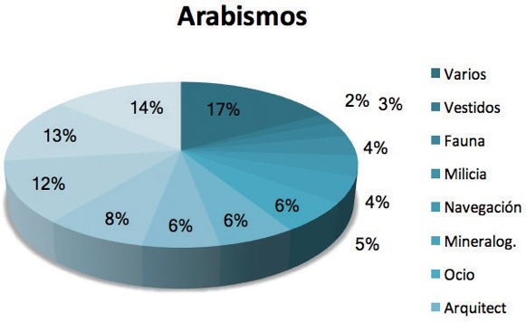 El diccionario hace un reconocimiento a través del léxico de la importancia del elemento árabe en el español, sobre todo porque ?el elemento árabe fue, después del latín el más importante del vocabulario español hasta el siglo XVI? ( Lapesa, 1980, p. 145). El diccionario se encarga de realizar por primera vez la divulgación de muchos arabismos al castellano, sobre todo en campos científicos como la técnica, que es muy específica del conocimiento humano ( Pavón Maldonado, 1977), la medicina ( Vázquez de Benito et al., 1989), la anatomía, la farmacia, la botánica, la arquitectura, la música, las matemáticas y la astronomía ( Ammadi, 2010).