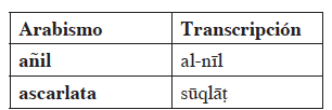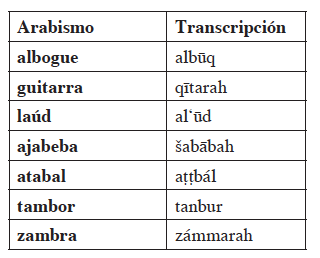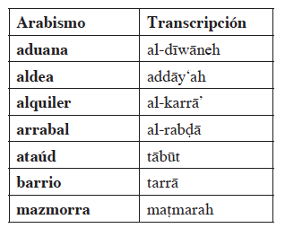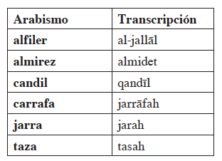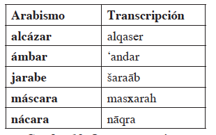 Tratándose este artículo de un acercamiento amplio a una investigación diacrónica mayor sobre la influencia de una lengua, en este caso el árabe, sobre otra, el español, influencia que se conoce como arabismo, es fundamental tratar brevemente las categorías gramaticales del árabe, sobre todo cuando la intención es pedagógica. Lo primero entonces es resaltar que cuando los alumnos aprenden la segunda lengua, en el caso de ser hablantes de árabe, lo primero que deben hacer frente al léxico es adaptar el sistema fonético y fonológico para realizar correctamente la pronunciación de los arabismos, ya que las diferencias con el español son grandes; es decir, deben reproducir los arabismos de acuerdo con las reglas del español ( Lastra, 1992). Ese acto dará lugar a un proceso de acomodación lingüística que siempre ha de estar presente en la situación de contacto. Para evidenciarlo se muestran los siguientes ejemplos en el Cuadro 1.