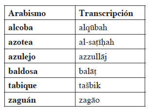 En materia de arquitectura, arte y construcción los arabismos se posicionaron en el mundo castellano. Los hay de habilidades manuales, elementos artesanales, constructivos con un lenguaje propio dentro de la arquitectura. El léxico se extendía a maestros de obra, a partes de las viviendas, por ejemplo: acicalar, /siqál/, ?instrumento para pulir o bruñir?; adobe, /attúb/ o /ladrillo/, ?masa de barro a veces mezclado con paja en forma de paralelípedo? o ?cubo de seis caras paralelas de dos a dos, secado al aire que se emplea en la construcción de muros?; adoquín, /addukkán/ o /addukkín/, ?piedra labrada en forma de prisma rectangular para empedrados y otros usos?; albañal, /alballá?a/, ?canal o conducto que da salida a las aguas negras?; albañil, /albanní/, ?maestro en el arte de construir edificios con ladrillos, piedras u otros materiales? o ?conocedor de oficios como murador (que sube o escala muros), tapiador, mazonero, pedrero, oficial y maestro de obra?; zaguán, /istawán/, ?portal o entrada de la casa?. ( Guerra Obando, 2002, p. 38).