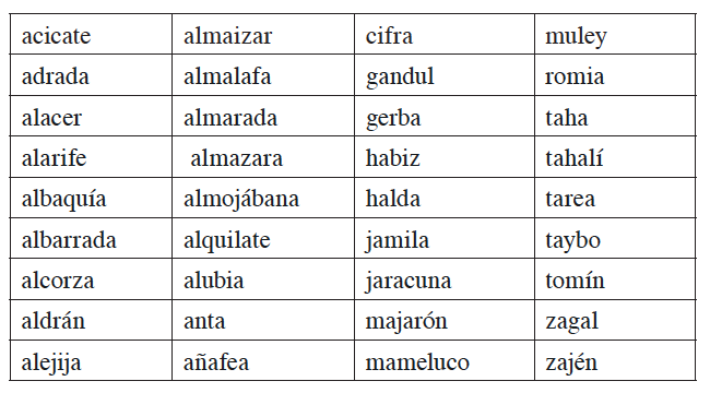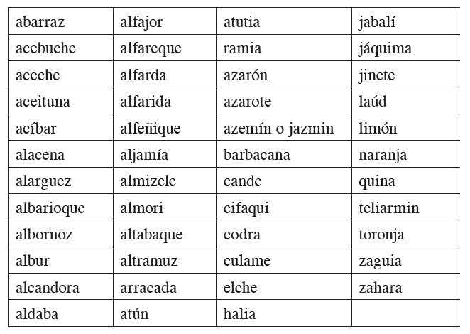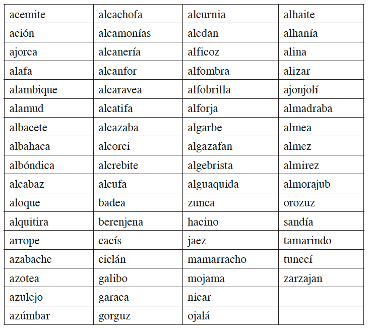 En español existen numerosos arabismos, muchos de uso muy frecuente, influencia que es muy notable. Un número tan elevado de palabras se explica por la necesidad de nombrar objetos y tareas que trajeron los árabes a la península y por el prestigio que entonces tenía una cultura tan avanzada. Los arabismos abarcan casi todos los campos de actividad humana y son, después del latín, el caudal léxico más importante del español, al menos hasta el siglo XVI ( González, 2015, p. 1). En la actualidad hay aproximadamente cuatro mil palabras árabes en el español. La RAE ( 2014) dice que el léxico del español contiene unos noventa y tres mil vocablos y de ellos el ocho por ciento, lo que equivale a siete mil cuatrocientas cuarenta palabras, son de origen árabe.