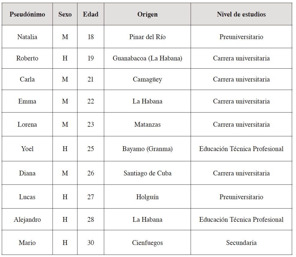 Como se observa, no aparecen los nombres reales de las personas entrevistadas, sino que se les ha sustituido por pseudónimos para asegurar su anonimato y privacidad. Por otro lado, en el origen geográfico se indica entre paréntesis la provincia de Cuba a la que pertenece la ciudad que la acompaña, siempre y cuando no coincida el nombre de la ciudad con el de su correspondiente provincia.