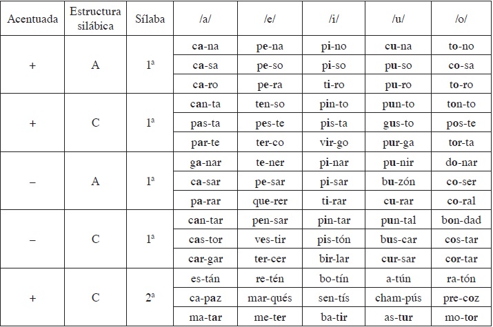 En lo que respecta a la condición acentuada/inacentuada, la mitad de las vocales del corpus nuclear son de cada tipo. Lo mismo vale para la variable del tipo silábico abierto/ cerrado. Por último, en el análisis del factor de la posición en la palabra (primera o segunda sílaba) se contrastaron las 15 palabras en las que la vocal relevante aparece en la última sílaba con las 15 palabras graves que llevan la vocal relevante en una sílaba cerrada acentuada.