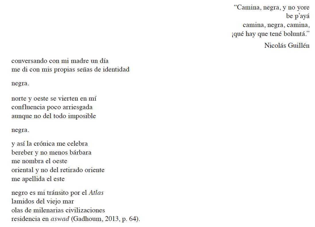 Las voces de estas poéticas, por tanto, pertenecen a sujetos culturales colonizados, cuyas subjetividades y actitudes están formadas en las fronteras de las historias locales y las experiencias de las historias coloniales de Occidente; en consecuencia, reactualizan el relato de la modernidad, al obedecer y materializar las articulaciones de la colonialidad de los siglos XVI y XIX. Tales sujetos viven la barra que une y separa la colonialidad: se reconocen a sí mismos como parte del adentro (la civilización europea gracias a sus raíces coloniales españolas y francesas) y afuera (árabes, mujeres, negros, bereberes, musulmanes). De modo que, a través de ellos, habla el anthropos creado por el humanitas.
