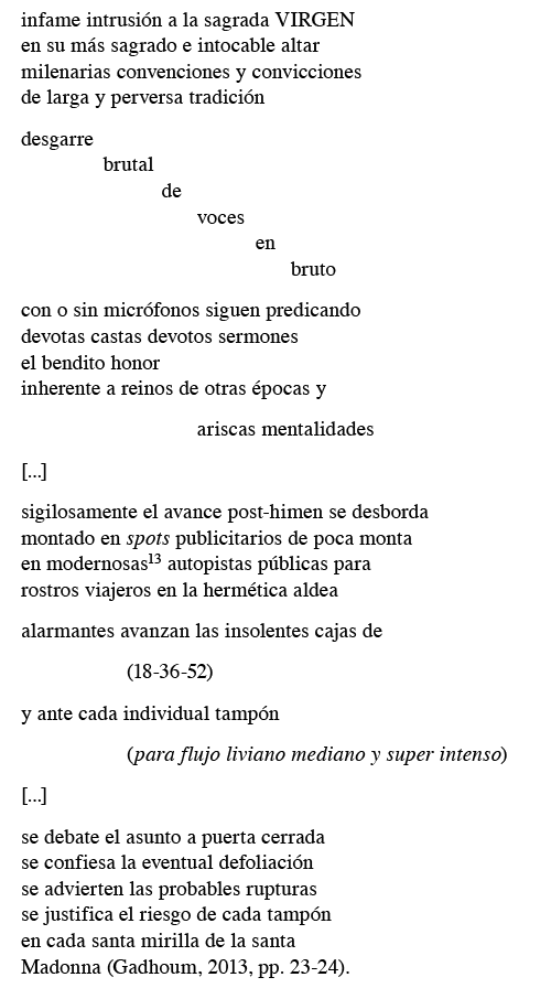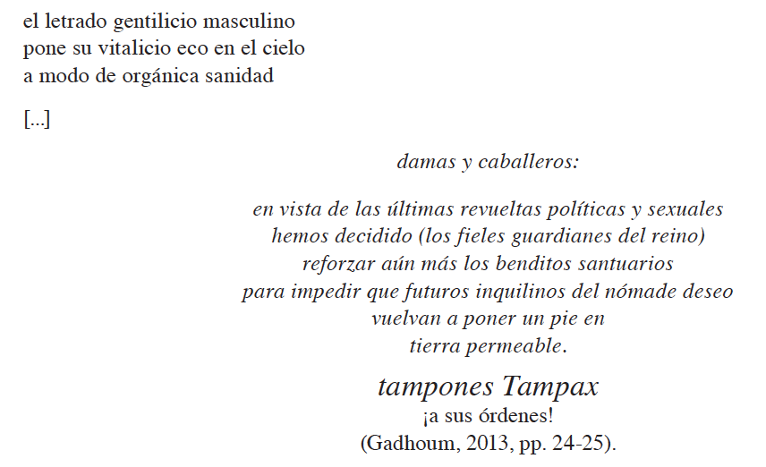 Con el feminismo decolonial, las hablantes líricas deconstruyen la política falogocentrista, proponiendo entender el género como una práctica discursiva que está teniendo lugar y, por tanto, abierta a la intervención y resignificación. Así lo entiende, por ejemplo, Butler (2007). Esta noción no-estable de género les permite a aquellas, por un lado, examinar los procedimientos políticos que originan y esconden las condiciones que conforman a las mujeres musulmanas; por otro, combatir las categorías uni-versales de sexo / género e identidad femeninos.