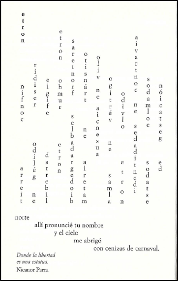 En este texto, la nieve presenta una doble morfología imaginaria, pues actúa como un símbolo teriomorfo al connotar la inclemencia y adversidades del medio, pero también como un símbolo catamorfo, pues la ideografía lírica en la primera estrofa imita la caída de la nieve, la cual sugiere el estancamiento de la cotidianidad destructora; esa realidad adversa y gélida hacia la que se encaminan los migrantes. Este encaminarse se observa igualmente representado en dicha ideografía lírica, ya que la lectura de las palabras de abajo arriba subraya la búsqueda del norte. Así pues, la doble morfología imaginaria del símbolo nieve y la ideografía lírica anuncian el destino frustrado que tendrán esas ?identidades en contravía? una vez que lleguen a ese norte, ensoñado como espacio de libertad según lo sugiere el epígrafe de Parra, pero que en realidad será todo lo contrario.
