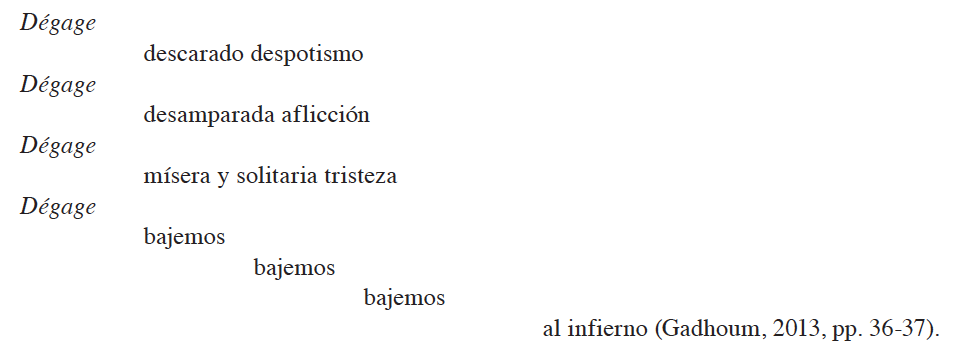 No obstante, en medio de estos mecanismos, se entrevén ?pizarrines risueños con tizas y coplas / de Al-Khansaa, Al-Chebbi, Hugo y Beaudelaire [sic]? ( Gadhoum, 2013, p. 22). Estos textos escritos por los dos primeros evidencian que ?aplíquense las palabras de Guénon? ?algunos espíritus no están ya satisfechos con la negación moderna, que experimentan la necesidad de otra cosa distinta de lo que les ofrece nuestra época, que entrevén la posibilidad de un retorno a la tradición, bajo una u otra forma, como único medio de salir de la crisis actual? ( 1988, p. 17). Al-Khansa fue la más valorada poeta dentro de la literatura árabe del siglo VII en la península arábiga. Abou al-Kacem Ecebbi (1909-1934) fue un escritor tunecino romántico, dedicado a exaltar la naturaleza y el patriotismo. Sus textos importarían más que los de Víctor Hugo y Baudelaire pues, aunque románticos y defensores del conocimiento y lenguaje irracionales negados por la razón, sus textos se cimientan sobre las bases históricas del liberalismo moderno, las cuales se encuentran en la Ilustración y la Revolución Francesa ( Mignolo, 2011). Por tanto, las voces líricas de Al-Khansa y Ecebbi aparecen como invitación para 1) rescatar la imaginación y comportamientos musulmanes alejados de las normas institucionales modernas que desean (de)limitarlos; 2) privilegiar una sensibilidad de mundo propia, otra. Sus textos entrevistos, sin duda, parecen apelar a la opción decolonial, frente a la crisis del mundo moderno 23.