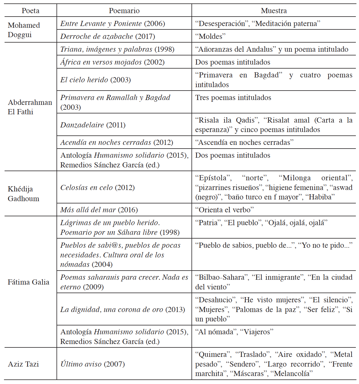 Para cumplir con tales objetivos, se trabaja con una muestra de 60 poemas ( Tabla 1), pertenecientes a la saharaui Fátima Galia, los marroquíes Abderrahman El Fathi y Aziz Tazi, y los tunecinos Mohamed Doggui y Khédija Gadhoum. A continuación, bríndanse algunos datos para situar grosso modo a estos poetas y sus producciones en el panorama de la poesía y cultura hispano-magrebíes.