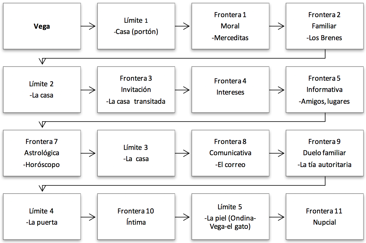 De acuerdo con Finol (2014a), el límite separa dos espacios, en este caso el mundo externo de Vega del mundo interno de la casa de Merceditas, y es, por lo tanto, una demarcación física que posibilita e imposibilita la aproximación entre él y la familia Brenes, entre el exterior y el interior, y entre lo público y lo privado La transgresión de cualquier límite se considera un delito, pero al convertirse en frontera puede ser superado. Así, Vega logra pasar la primera frontera, antes límite, con el ingreso a la casa de los Brenes a causa de la invitación a tomar un café. La conversión de un límite en frontera es posible mediante el acceso otorgado por la familia, quien, en este caso, es la figura actancial que tiene el poder para imponer y levantar la restricción de paso: