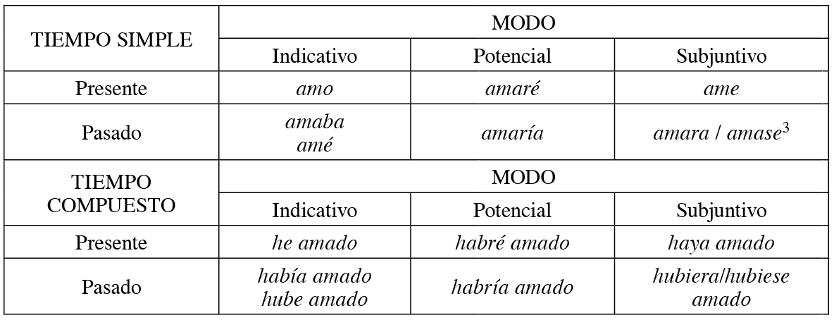 Propiamente, las formas de potencial son de futuro: la simple amaré y la compuesta habré amado son el presente de potencial, y la simple amaría y la compuesta habría amado, el pasado de potencial ( Vásquez González, 2013, p. 263). Se comprende que el esquema de la Tabla 1, a la vez tradicional y moderno, despliega un modelo estructuralista conforme quizás a la ?estética de la simetría?, lo que es discutido por algunos autores ( Fernández González, 1993). Se ha planteado la cuestión sobre cuáles formas verbales, atendiendo al uso, la descriptiva y la comparación con otras lenguas, se deberían añadir en (o excluir de) el sistema de la conjugación, aparte de las tradicionales simple y compuesta ( Rojo y Veiga, 1999). Con todo, esperamos que se nos conceda el esquema suscrito, a fin de cumplir el objetivo principal que es esclarecer un concepto que difiere del de aspecto: el estado.