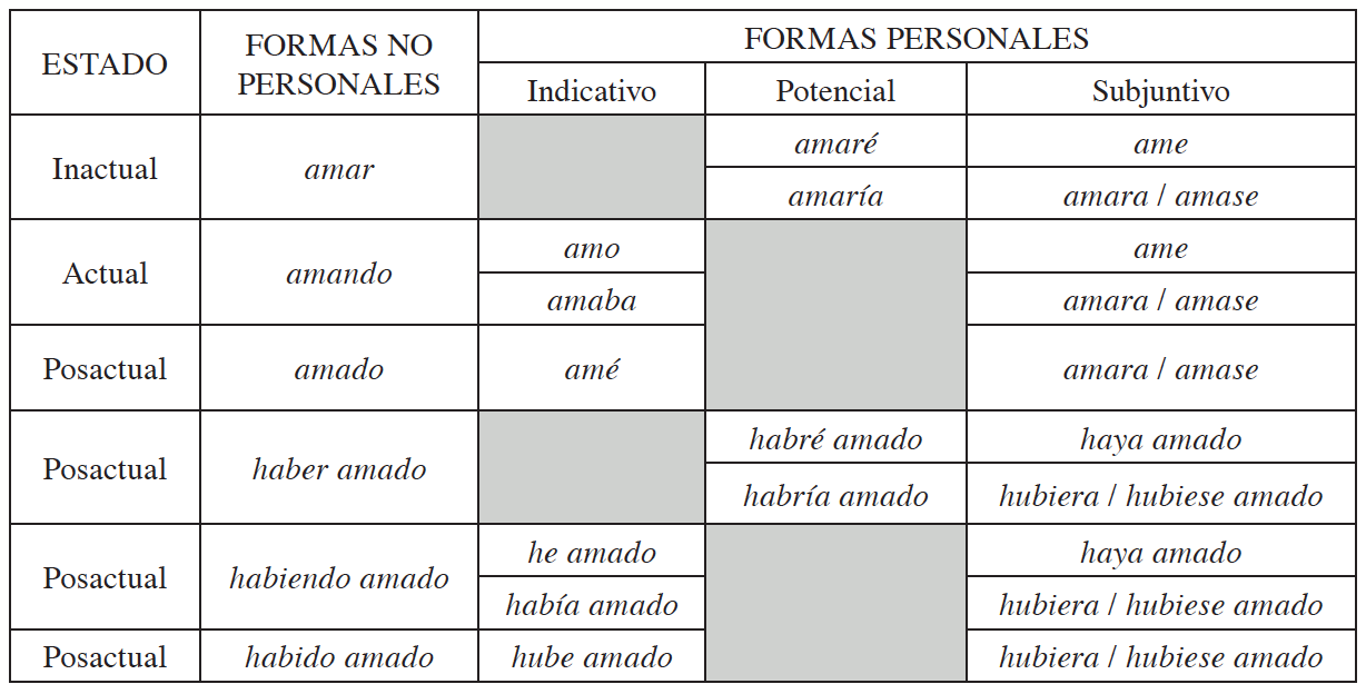 Algo en común tienen las formas no personales con las formas personales de indicativo, potencial y subjuntivo: el estado. Esto se puede visualizar en la Tabla 3. En cuanto a las formas no personales compuestas ( haber amado, habiendo amado y habido amado), todas son posactuales debido a que el participio les define el estado.