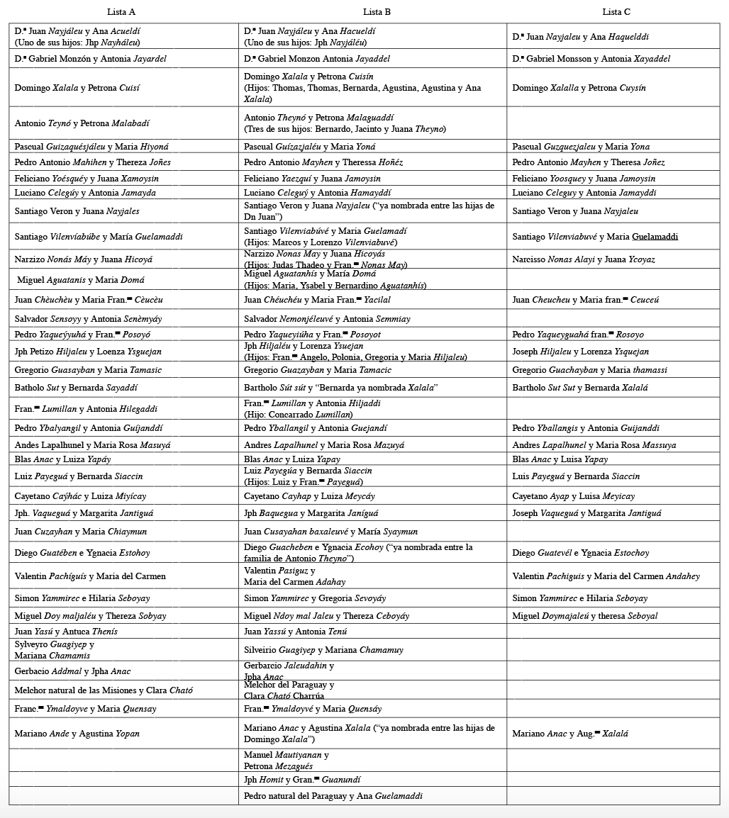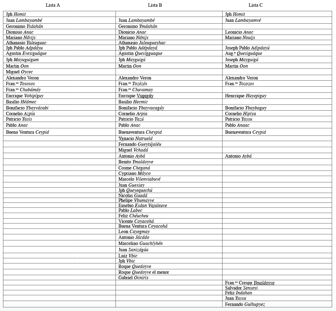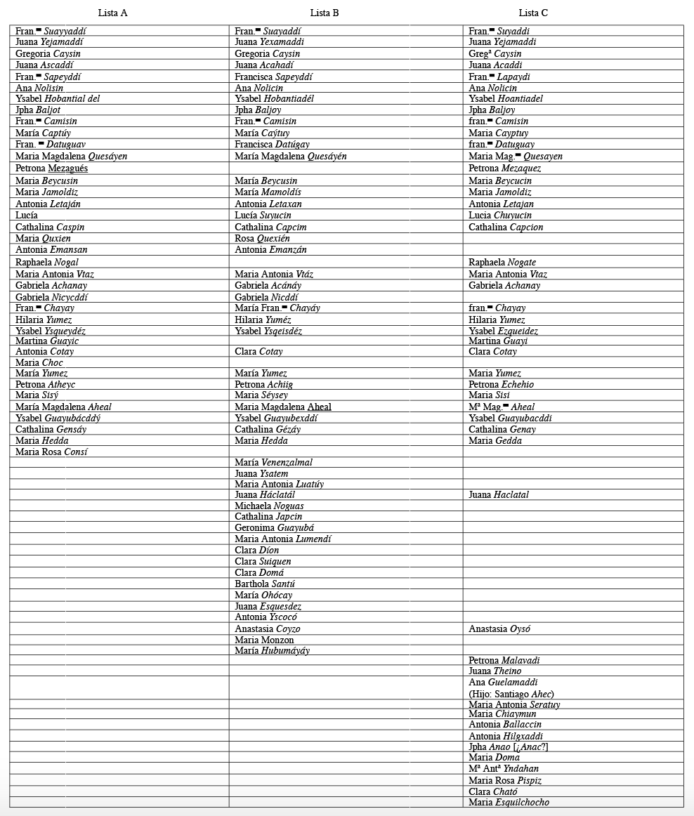 En las tablas 1 a 4 se presentan los datos de las nóminas A, B y C, manteniendo los cortes por categoría social. El propósito principal de estas tablas es facilitar la comparación de los nombres que aparecen en las distintas listas. El único orden de los nombres que se ha respetado minuciosamente es el que aparece en la lista A, el de las otras dos listas ha sido acomodado al de esta última. Solo cuando en la lista B aparecen nombres no identificables ?o al menos, no identificables fácilmente? con los de la lista A, se sigue el orden de la lista B; y finalmente cuando en la lista C aparecen nombres no identificables con los de las listas A y/o B se sigue el orden de los nombres de la lista C.