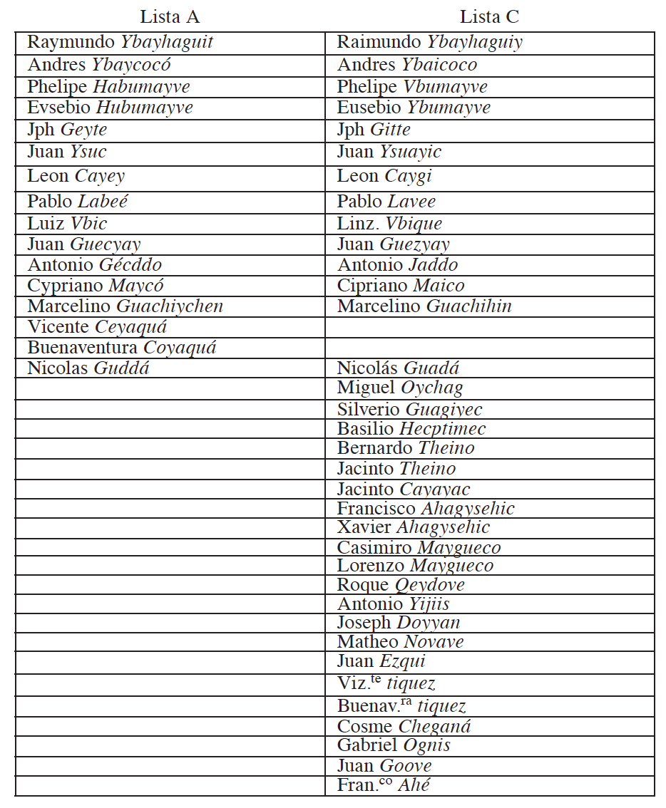 Las razones por las que se realizaron los tres censos de charrúas reducidos en Cayastá son desconocidas ( Bracco, 2016, p. 24). La primera lista (a la que en el presente trabajo se llamará lista A) se realizó el 2 de agosto de 1758 23, la segunda (lista B) el 20 del mismo mes 24, y la tercera (lista C) un par de años después, el 17 de marzo de 1760 25. Las tres listas son diferentes entre sí: la cantidad total de individuos mencionados es distinta en cada lista, aunque es evidente que la mayoría de las personas aparecen citadas en las tres nóminas. La lista B es la más extensa y la lista C es la más breve. Sin duda es un tema interesante la fluctuación demográfica que implican estas diferencias, pero es una cuestión que escapa al alcance del presente trabajo.