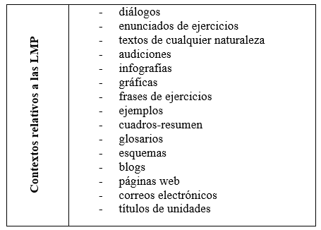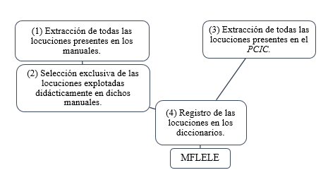 Al considerar el manual como el instrumento de enseñanza más inmediato en una institución de enseñanza acreditada, como ya se ha adelantado, este supuso una de las fuentes primarias del MFLELE. Su justificación es obtener un corpus real de locuciones que se ajuste a la realidad con la que trabajan los docentes en su aprendizaje diario; al mismo tiempo que se da por hecho que los exponentes lingüísticos manifestados en los manuales se ajustan a voces actuales, frecuentes y de vigencia en el español peninsular. Como consecuencia, en aquellas ocasiones en las que se divisó una locución propiamente de otra variedad no peninsular del español, se elidió por sobrepasar los límites de la investigación.