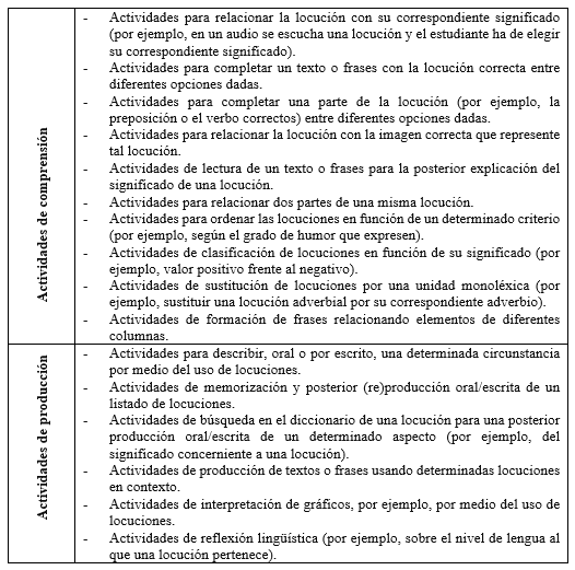 Desde el terreno lexicográfico y, en especial, gracias a los diccionarios de Penadés Martínez ( DICLOCVER, DICLOCADV y DICLOCNAP) se dispone de un inventario de locuciones verbales, adverbiales, nominales, adjetivas y pronominales que podrían trabajarse en la enseñanza de ELE desde el nivel B1. Asimismo, en este estudio se persigue proponer, a partir de una metodología propia y desde el nivel A1, un conjunto de locuciones que podrían tenerse en cuenta según el estadio lingüístico del estudiante, así como el subtipo de locución (verbal, adjetival, adverbial, etc.).