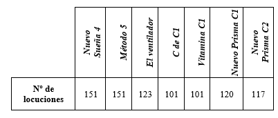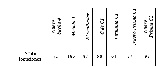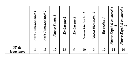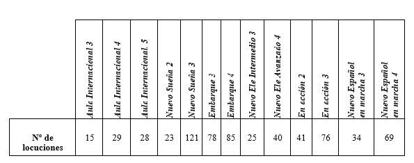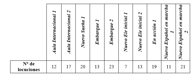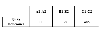 Fruto de la ejecución de este primer criterio, se presenta el número de locuciones obtenidas por nivel y por manual en la Tabla 2 (referente al nivel A1-A2), en la Tabla 3 (en vínculo con el nivel B1-B2) y en la Tabla 4 (en relación con nivel C1-C2), respectivamente.