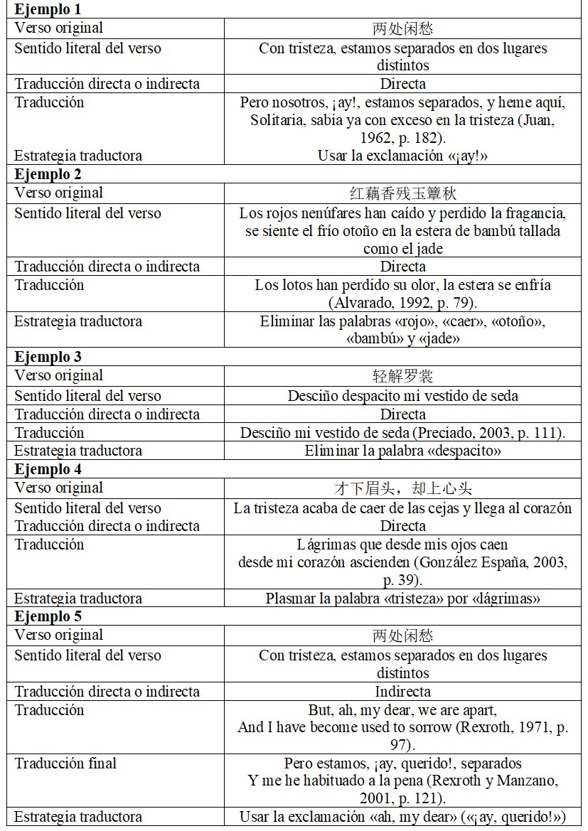 En los otros casos de la Tabla 4 se han suprimido algunos contenidos aparecidos en el poema original. En el segundo caso, las palabras “rojo”, “caer”, “otoño”, “bambú” y “jade” están eliminadas; mientras que, en el tercero, “despacito” no está traducida. Aunque las iniciativas de los traductores consisten en no alargar los versos traducidos para que se adecuen más a la brevedad de los originales (que solo tienen cuatro o siete caracteres chinos), sus estrategias tomadas provocan que algunas informaciones del poema original desaparezcan de las traducciones.