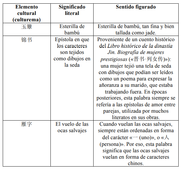 Los elementos culturales (culturemas) metafóricos de la composición suponen otro desafío para los traductores. A pesar de que ellos han aplicado técnicas variadas para solucionar este problema –como la generación, la reducción o la búsqueda de una equivalencia en la lengua meta–, algunos no han conseguido a transmitir con exactitud el sentido metafórico de los elementos sino solo ocultarlo. Así pues, consideramos más fieles las traducciones que han plasmado los contenidos metafóricos o que los han revelado con notas explicativas, como las de Pilar González España o de Miguel Salas Díaz y Kuo Tsai Chia.