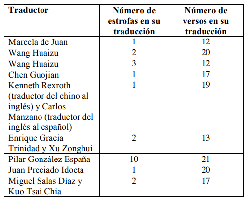 En la Tabla 1, se percibe que, en cuanto al número de versos, la mayoría de los traductores lo ha incrementado en sus versiones y solo Marcela de Juan y Harold Alvarado han mantenido la misma cantidad. En cuanto a las estrofas, Wang Huaizu, Enrique Gracia Trinidad y Xu Zonghui, Miguel Salas Díaz y Kuo Tsai Chia han conservado las dos, mientras que Marcela de Juan, Chen Guojian y Juan Preciado Idoeta las han reducido a una. Carlos Manzano se ha mantenido fiel a las decisiones tomadas por el traductor intermediario Kenneth Rexroth, puesto que en la versión inglesa del poema también hay una sola estrofa. Sin embargo, ha cambiado el número de versos, de veinte a diecinueve4.